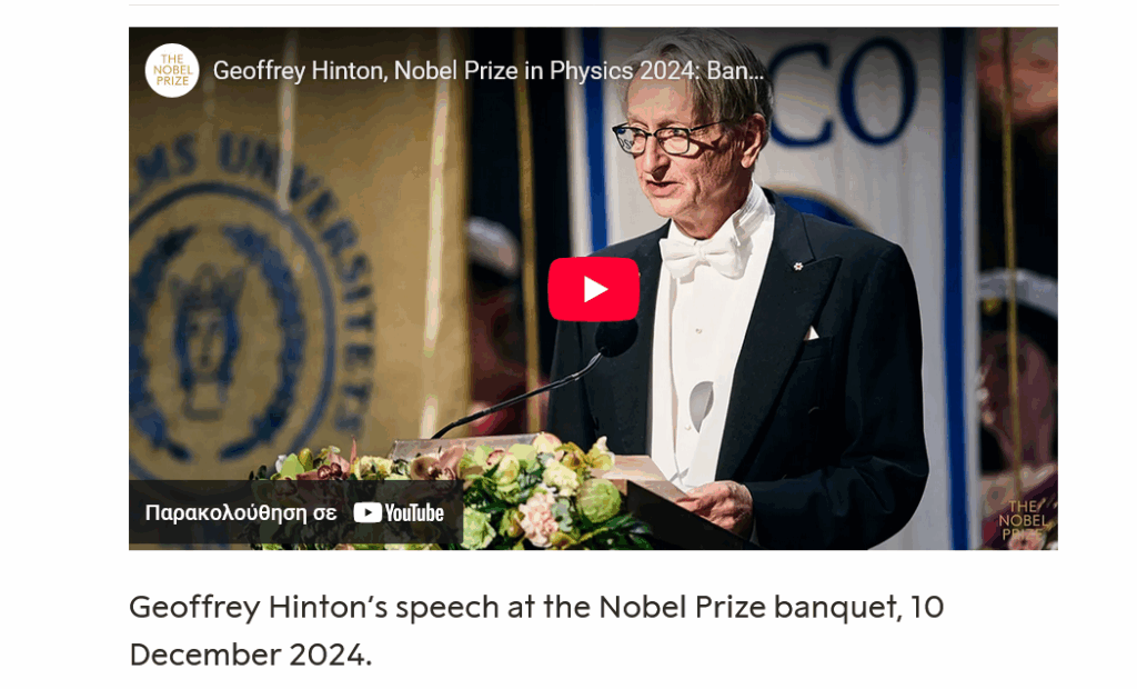 Απόσπασμα από την ομιλία του Geoffrey Hinton, στην τελετή απονομής βραβείων Νόμπελ, 10 Δεκεμβρίου 2024, κατά την οποία βραβεύτηκε με το βραβείο Νόμπελ στη Φυσική, μαζί με τον John Hopfield: